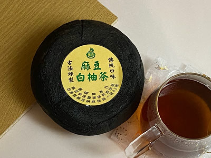 白柚茶是將裡面的柚子肉掏乾淨,挖出的果肉與茶葉攪拌後塞回去,所有的過程都得要手工進行,再經過壓,九蒸九曬的手續才能完成,完成後還要再放約10年才能悶出特有的風味。